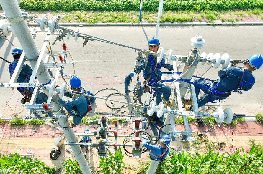 入夏以來,持續(xù)的高溫天氣讓電網(wǎng)負荷面臨極大“烤”驗。國網(wǎng)滑縣供電公司加快推進電網(wǎng)升級補強、安全隱患治理等工作,切實提升電網(wǎng)運行質(zhì)量和供電可靠性,為廣大用戶清涼度夏提供充足電力保障。當天,在10千伏留賈線新建工程現(xiàn)場,作業(yè)人員穿戴好全套安全防護用具,動作熟練地爬上電桿,嚴格按照操作標準逐項完成接開關(guān)引流線、安裝真空開關(guān)等一系列操作。天氣炎熱加上施工作業(yè),工作人員的臉上很快就冒出了豆大的汗珠,他們顧不得擦去,只專注于手中的操作。他們從早上6:30分開始,經(jīng)過6個多小時的揮汗奮戰(zhàn),12:25分,10千伏留賈線路運成功,為附近村民生產(chǎn)生活用電提供堅強電力能源保障,確保“清涼”度夏。