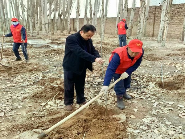 上午十點(diǎn),春風(fēng)送爽,天氣宜人。20余名員工按照分工要求,同志們迫不及待地拿起鐵鍬開始鏟土,認(rèn)真細(xì)致地挖著樹苗和土坑,一陣緊張的忙碌過后,大家將樹苗立在土坑上面,扶好樹苗,精心的完成著從挖坑、放樹、填土、踩實到最后澆水的每一個步驟,有條不紊,很快一棵樹苗站立起來。