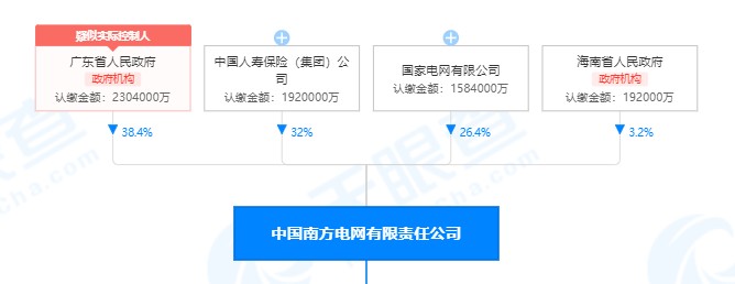根據(jù)公開資料查詢,本次調(diào)整前中國南方電網(wǎng)總注冊資本為600億元。共有4家股東,股本比例是:廣東省人民政府出資230.4億,占比38.4%,為第一大股東,中國人壽保險(集團(tuán))公司出資192億,占比32%,排名第二,國家電網(wǎng)有限公司出資158.4億,占比26.4%,排名第三,海南省人民政府認(rèn)繳19.2億,占比3.2%,排名最末。