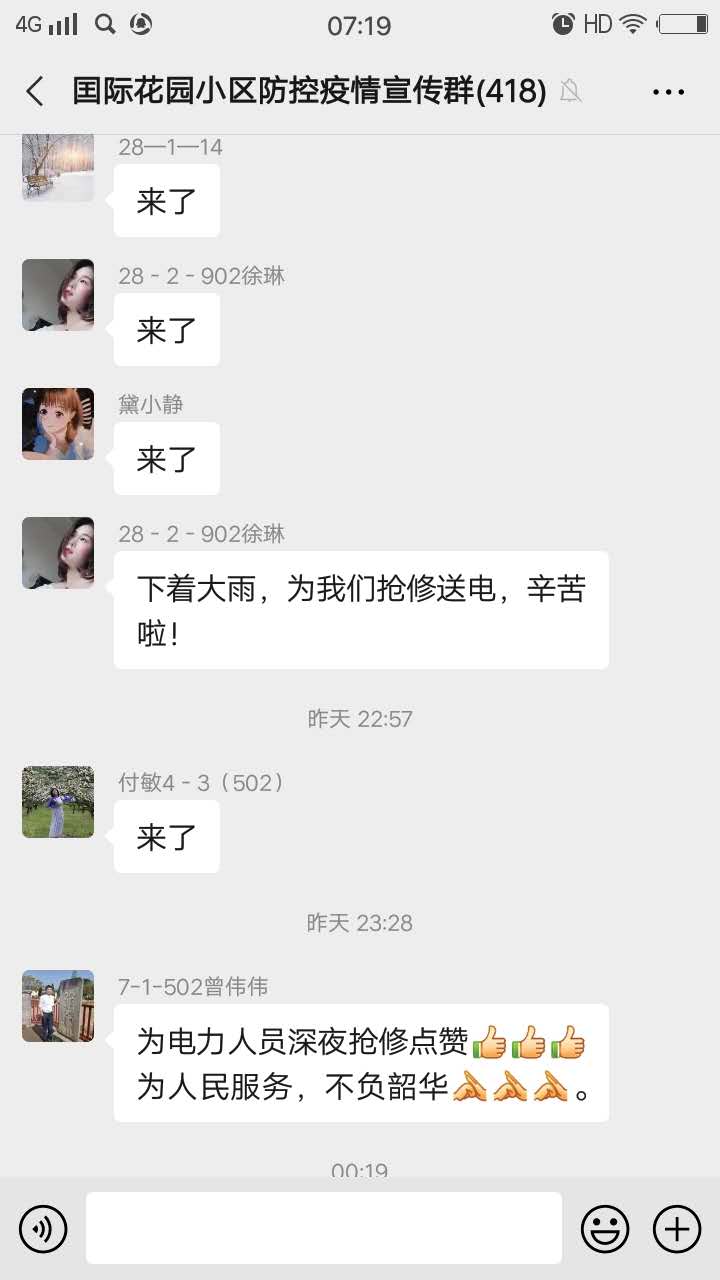 中國(guó)電力網(wǎng)訊 客戶(hù)又一次在微信群里表?yè)P(yáng)國(guó)網(wǎng)南豐縣供電公司搶修人員“為人民服務(wù),不負(fù)韶華,”并為他們點(diǎn)贊。