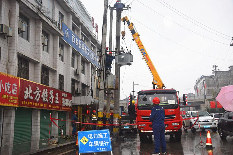 當(dāng)日早上,西鄉(xiāng)分公司組織西區(qū)運(yùn)維班投入到緊張搶修工作中。由于現(xiàn)場(chǎng)地處繁華的交通要道,作業(yè)環(huán)境復(fù)雜,于是將搶修人員分為兩組,一組負(fù)責(zé)更換更換配變,另一組負(fù)責(zé)更換0.4千伏線路導(dǎo)線。在充分做好、做細(xì)各項(xiàng)安全措施后,各組人員協(xié)同作戰(zhàn),分別開展著桿上拆除舊導(dǎo)線、舊變壓器、桿下做電纜頭、施放新導(dǎo)線、吊裝變壓器等一系列工作,在工作負(fù)責(zé)人統(tǒng)一指揮下,搶修作業(yè)有條不紊的進(jìn)行著。時(shí)間一分一秒的在流逝,徹骨透寒瀟瀟雨,打濕了大街的繁華,浸透搶修人員的工裝,為了群眾屋子溫暖如春,他們頂風(fēng)冒寒接線供電,任雨水、汗水在臉上流淌。經(jīng)過大家通力合作,下午14時(shí),搶修工作圓滿結(jié)束,該臺(tái)區(qū)順利恢復(fù)了供電。