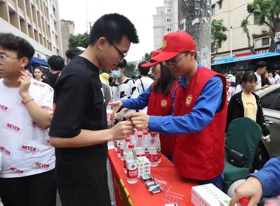 “保持平常心態(tài),加油,你們一定能考出好成績。”上午8時(shí)20分左右,隨著考生陸續(xù)進(jìn)場,志愿服務(wù)點(diǎn)前熱鬧了起來,志愿者一邊為有需要的考生派發(fā)考試和防暑用品,一邊為他們加油鼓勁。