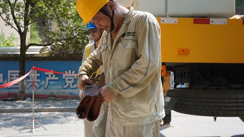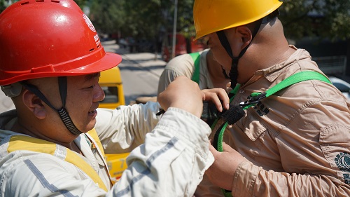 “帶電作業(yè)的方法有三種,分別是中間電位作業(yè)法、地電位作業(yè)法以及等電位作業(yè)法,今天我們采用的中間電位作業(yè)法。今天天氣不錯(cuò),雖然溫度高,但濕度低,能夠滿足帶電作業(yè)條件。帶電作業(yè)必須身著密不透風(fēng)的絕緣套裝,在高溫下,作業(yè)人員體感往往會(huì)達(dá)到60℃。雖然辛苦,但只要能少停電,盡可能的給人民群眾帶去清涼,再苦再累都值得。”帶電作業(yè)班班長張敏說道。