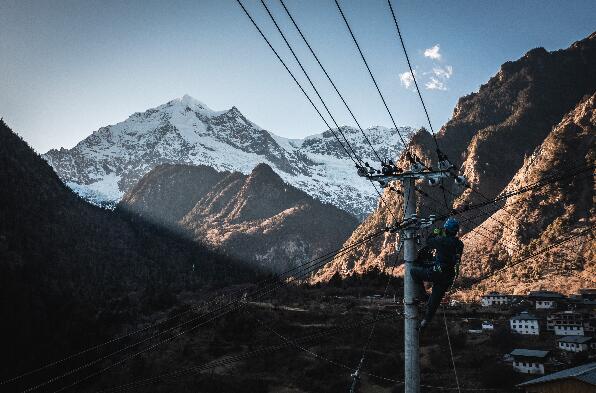 收到村民反映停電故障后,旺登一行立即開展檢查,發(fā)現(xiàn)故障出現(xiàn)在雨崩上村2號(hào)臺(tái)區(qū),且需要爬上12米高的電線桿進(jìn)行作業(yè)。只見(jiàn)旺登綁緊安全帶,戴上絕緣手套,踩實(shí)腳扣,并進(jìn)行簡(jiǎn)短的沖擊試驗(yàn)。隨后,他雙手扶住桿體,左腳穩(wěn)穩(wěn)地扣住,接著右腳向上提,一步一步交叉著往上。