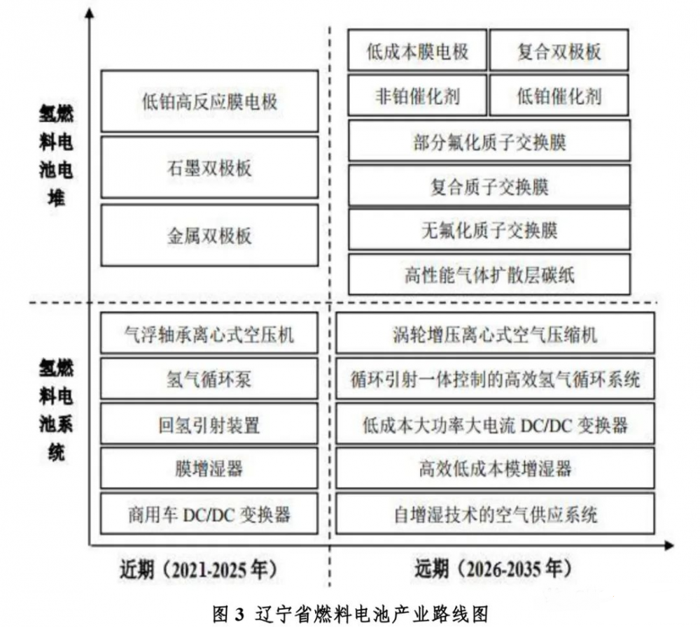 近期(2021-2025年),重點(diǎn)發(fā)展低成本、大功率的燃料電池電堆及規(guī)?;a(chǎn)。加快培育發(fā)展石墨雙極板、金屬雙極板,突破技術(shù)瓶頸。積極發(fā)展低鉑、高反應(yīng)效率的膜電極,并實(shí)現(xiàn)批量化生產(chǎn)。重點(diǎn)突破氣體擴(kuò)散層規(guī)?;a(chǎn)瓶頸。遠(yuǎn)期(2026-2035年),重點(diǎn)發(fā)展高功率密度、大功率輸出、長壽命運(yùn)行、低成本制造的燃料電池電堆。著力發(fā)展低成本金屬雙極板、復(fù)合雙極板。加快培育發(fā)展高性能低成本膜電極,推進(jìn)本地化和規(guī)模化發(fā)展。重點(diǎn)支持部分氟化、無氟化、復(fù)合質(zhì)子交換膜的研發(fā)和生產(chǎn)。著力開發(fā)新型高穩(wěn)定、高活性的低鉑或非鉑催化劑等低成本催化劑,并實(shí)現(xiàn)量化生產(chǎn)。大力發(fā)展氣體擴(kuò)散層,實(shí)現(xiàn)高性能氣體擴(kuò)散層碳紙等關(guān)鍵材料的本地化生產(chǎn)。
