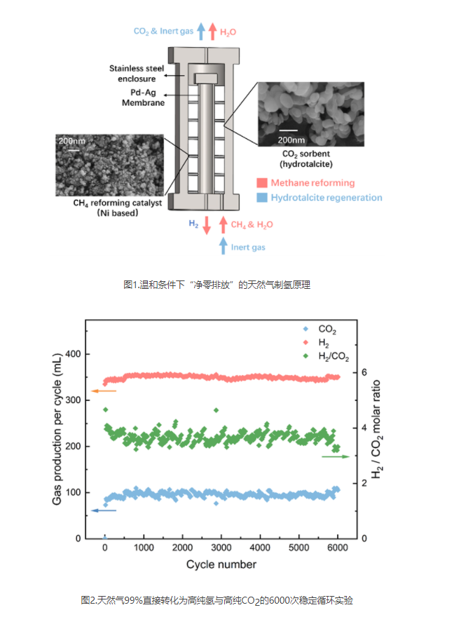 中國(guó)科學(xué)院工程熱物理研究所首次實(shí)現(xiàn)了400°C溫和條件下“凈零排放”的天然氣制氫原理突破。通過(guò)有序分離氫氣和二氧化碳產(chǎn)物,天然氣制氫反應(yīng)溫度由傳統(tǒng)的800-1000°C降至400°C以下,實(shí)現(xiàn)了99%以上甲烷直接轉(zhuǎn)化為高純氫與高純二氧化碳,并實(shí)現(xiàn)了基于化石能源的制氫與脫碳的完全協(xié)同。制氫與脫碳能耗下降幅度達(dá)20-40%?;诖耍摴ぷ鹘Y(jié)合商業(yè)化中溫槽式聚光技術(shù),實(shí)現(xiàn)了太陽(yáng)能驅(qū)動(dòng)的天然氣制氫與脫碳,進(jìn)一步減少化石能源制氫的碳足跡,展示了化石能源與可再生能源互補(bǔ)實(shí)現(xiàn)可持續(xù)氫能利用的可行性。反應(yīng)溫度的降低使工業(yè)余熱與氫能的結(jié)合成為可能。迄今為止,研究人員已完成了超過(guò)6000次的穩(wěn)定循環(huán)實(shí)驗(yàn),驗(yàn)證了該方法的可靠性,并初步展示了技術(shù)轉(zhuǎn)化應(yīng)用的廣闊前景。