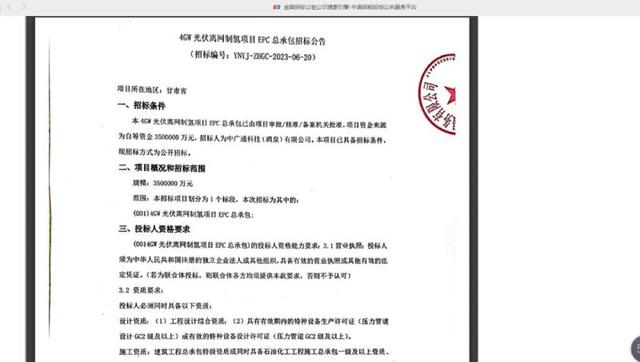 通報(bào)還稱,6月12日,該公司在區(qū)市場(chǎng)監(jiān)管局注冊(cè)全資子公司中廣通科技(酒泉)有限公司。6月13日,中廣通科技(酒泉)有限公司工作人員嚴(yán)微明向項(xiàng)目聯(lián)系人、區(qū)工信局副局長馬斌提交公司營業(yè)執(zhí)照復(fù)印件、《“離網(wǎng)制氫”項(xiàng)目投資合作協(xié)議》兩份資料,由馬斌代其在甘肅省政務(wù)網(wǎng)在線審批監(jiān)管平臺(tái)提交了項(xiàng)目備案申請(qǐng),區(qū)發(fā)改局政務(wù)大廳首席代表李倩在向分管領(lǐng)導(dǎo)王泉德匯報(bào),并向酒泉新能源綜合利用產(chǎn)業(yè)園管理辦公室副主任閆斌征求意見后,為該公司辦理了項(xiàng)目備案。6月21日,中廣通科技(酒泉)有限公司在未進(jìn)行項(xiàng)目可行性研究,未辦理項(xiàng)目規(guī)劃、土地、環(huán)評(píng)等前期手續(xù),也未與相關(guān)部門溝通的情況下,在“中國招投標(biāo)公共服務(wù)平臺(tái)”發(fā)布了《4GW光伏離網(wǎng)制氫項(xiàng)目EPC總承包招標(biāo)公告》。