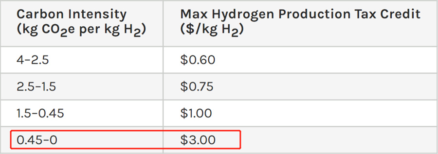 根據(jù)氫氣生產(chǎn)路徑碳強度的不同,稅收抵免激勵程度也不同,比如如果生產(chǎn)1千克的氫氣只排放0-0.45千克的二氧化碳當(dāng)量,就可以獲得3美元/公斤的最高補貼。并且,綠氫項目還可申請最高30%的投資稅收抵免。
