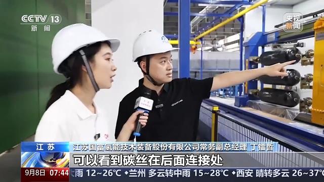 江蘇國(guó)富氫能技術(shù)裝備股份有限公司常務(wù)副總經(jīng)理 丁鐳哲:這里是我們的核心工藝之一,碳纖維纏繞。你可以看到碳絲在后面連接處,就像一個(gè)織布機(jī)一樣,一層一層往上織。碳纖維主要是用來(lái)承壓的。