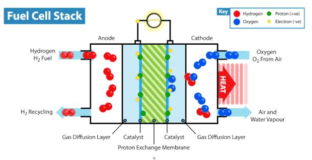 氫燃料電池工作原理是氫氣通過(guò)燃料電池正極當(dāng)中的催化劑(鉑)分解成電子和氫離子(質(zhì)子)。其中質(zhì)子通過(guò)質(zhì)子交換膜(Proton Exchange Membrane)到達(dá)負(fù)極和氧氣反應(yīng)變成水和熱量。對(duì)應(yīng)的電子則從正極通過(guò)外電路流向負(fù)極產(chǎn)生電能。