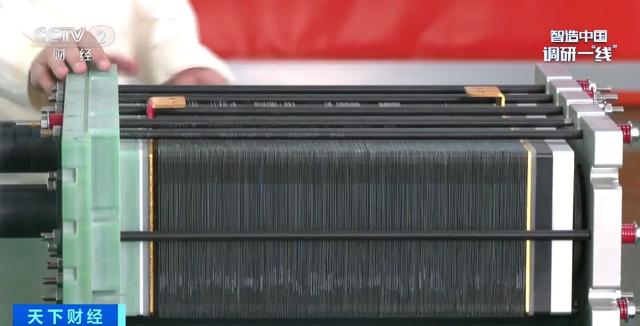 一條產(chǎn)線正在進(jìn)行膜電極的生產(chǎn),制作過程就是將催化劑均勻涂在質(zhì)子交換膜的兩側(cè)。這條產(chǎn)線的催化劑只有3微米厚,相當(dāng)于正常頭發(fā)絲的二十分之一。它可以使生產(chǎn)的膜電極更薄、重量更輕,從而降低整個(gè)電堆的厚度,提高功率。目前,這條產(chǎn)線可以實(shí)現(xiàn)每天生產(chǎn)1萬片膜電極。