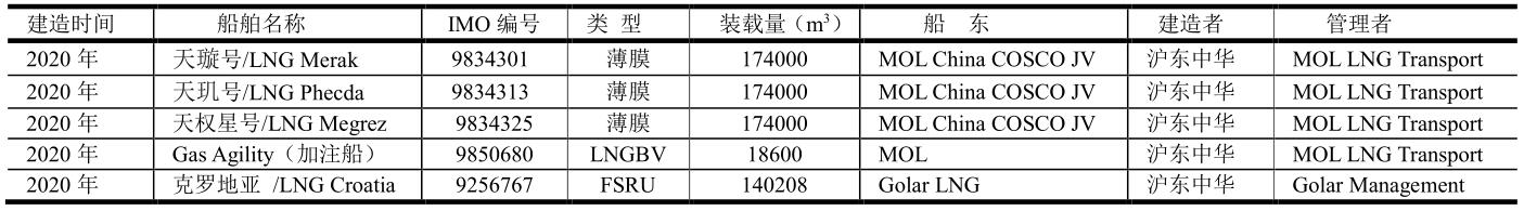 2020年全球交付47艘船舶,包括6艘FSRU和11艘小于50000m3的船舶。交付船舶的平均容量(不包括FSRU和小于50000m3的船舶)為174765m3。2020年中國(guó)交付了四艘LNG運(yùn)輸船舶。