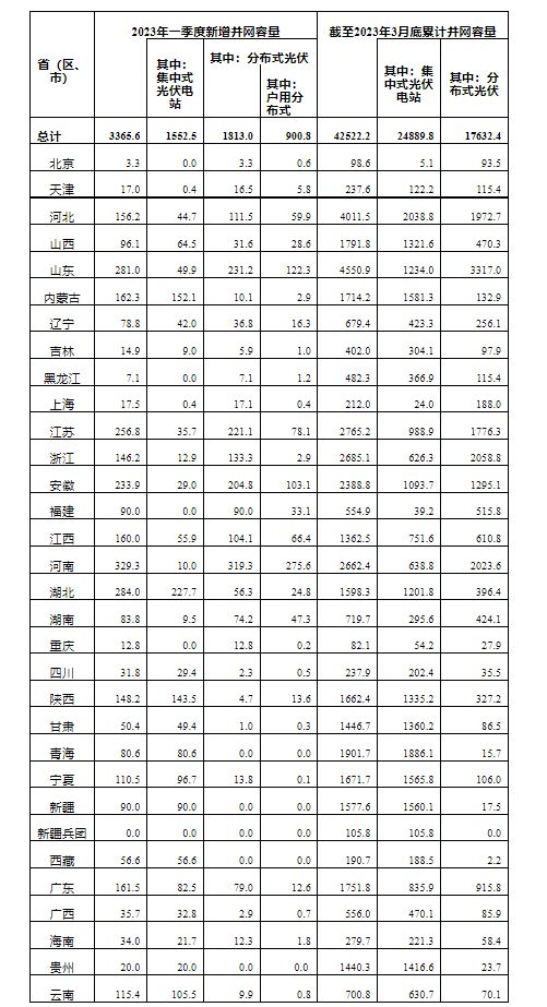 據(jù)國家能源局消息,國家能源局公布2023年一季度光伏發(fā)電建設(shè)運(yùn)行情況。一季度新增并網(wǎng)容量3365.6萬千瓦。其中,集中式光伏電站1552.5萬千瓦,分布式光伏1813.0萬千瓦。截至2023年3月底累計(jì)并網(wǎng)容量42522.2萬千瓦。
