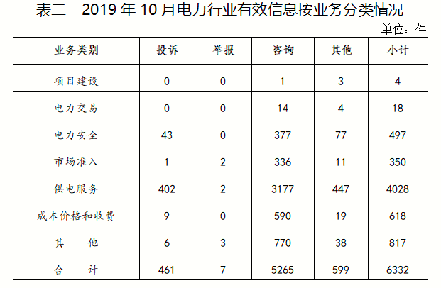 電力行業(yè)排在首位,有效信息數(shù)量為6332件,占全部有效信息的78.64%;其中受理的投訴舉報(bào)數(shù)量為449件,占全部投訴舉報(bào)數(shù)量的92%。群眾反映的問(wèn)題主要集中在供電服務(wù)、電力安全、成本價(jià)格和收費(fèi)等方面。(2019年10月電力行業(yè)有效信息按業(yè)務(wù)分類情況見(jiàn)表二)