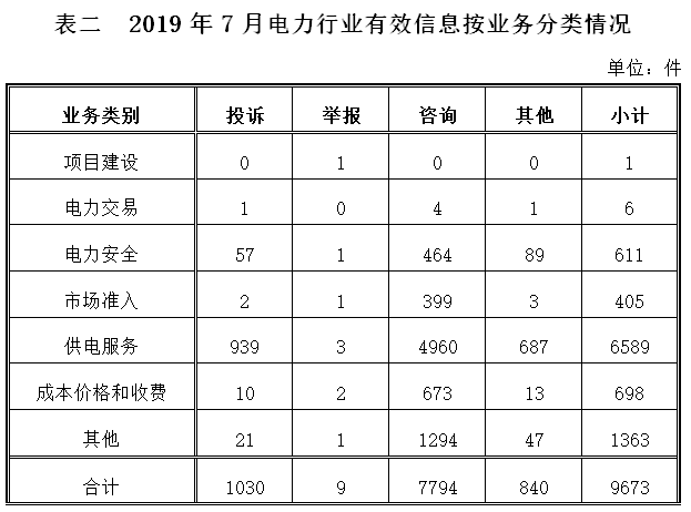 電力行業(yè)排在首位,有效信息數(shù)量為9673件,占全部有效信息的82.92%;其中受理的投訴舉報數(shù)量為1039件,占全部投訴舉報數(shù)量的96.38%。群眾反映的問題主要集中在供電服務、電力安全、成本價格和收費等方面。(2019年7月電力行業(yè)有效信息按業(yè)務分類情況見表二)