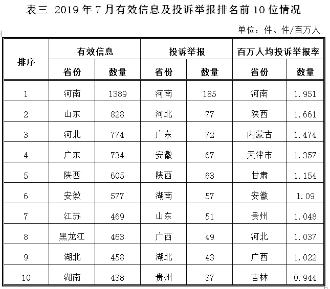 各省(自治區(qū)、直轄市)按照收到的有效信息數(shù)量排序,河南、山東、河北、廣東、陜西等排在全國前10位;按照投訴舉報數(shù)量排序,河南、河北、廣東、安徽、陜西等排在全國前10位;按照百萬人均投訴舉報數(shù)量排序,河南、陜西、內蒙古、天津、甘肅等排在全國前10位。(2019年7月有效信息及投訴舉報排名前10位情況見表三)
