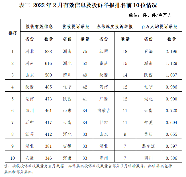 各省(自治區(qū)、直轄市)按照接收的有效信息數(shù)量排序,河北、河南、山東、陜西、湖南、四川、遼寧、江蘇、湖北、安徽排在全國(guó)前10位;按照接收的投訴舉報(bào)數(shù)量排序,湖南、湖北、四川、遼寧、陜西、山東、云南、河北、安徽、河南排在全國(guó)前10位;按照辦結(jié)屬實(shí)的投訴舉報(bào)數(shù)量排序,江西、重慶、陜西、河南、廣西、內(nèi)蒙古、甘肅、山東、湖北、貴州排在全國(guó)前10位;按照百萬(wàn)人均投訴舉報(bào)數(shù)量排序,青海、湖南、陜西、遼寧、湖北、云南、寧夏、重慶、黑龍江、四川排在全國(guó)前10位。(2022年2月有效信息及投訴舉報(bào)排名前10位情況見表三)