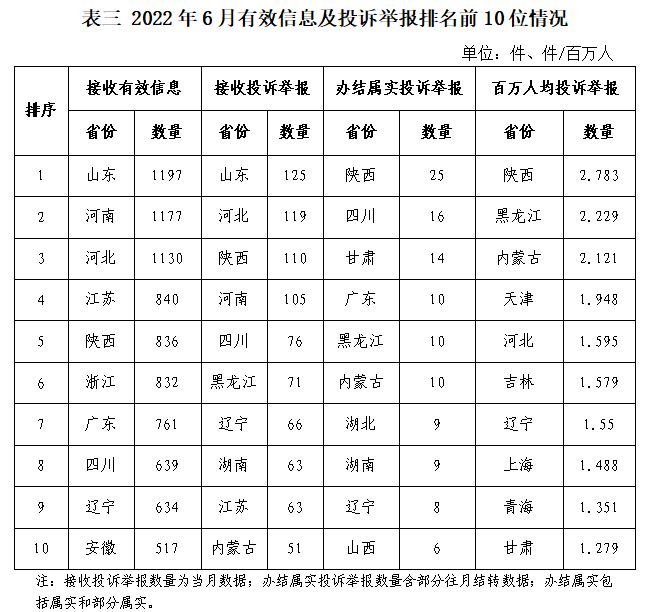 各省(自治區(qū)、直轄市)按照接收的有效信息數(shù)量排序,山東、河南、河北、江蘇、陜西、浙江、廣東、四川、遼寧、安徽排在全國前10位;按照接收的投訴舉報數(shù)量排序,山東、河北、陜西、河南、四川、黑龍江、遼寧、湖南、江蘇、內(nèi)蒙古排在全國前10位;按照辦結(jié)屬實的投訴舉報數(shù)量排序,陜西、四川、甘肅、廣東、黑龍江、內(nèi)蒙古、湖北、湖南、遼寧、山西排在全國前10位;按照百萬人均投訴舉報數(shù)量排序,陜西、黑龍江、內(nèi)蒙古、天津、河北、吉林、遼寧、上海、青海、甘肅排在全國前10位。(2022年6月有效信息及投訴舉報排名前10位情況見表三)