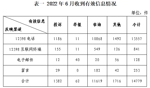 2022年6月,國家能源局12398能源監(jiān)管熱線(以下簡稱12398熱線)共收到有效信息14779件(包含投訴、舉報、咨詢和其他訴求類別),環(huán)比增加43.12%,同比增加49.28%。(2022年6月收到有效信息情況見表一)