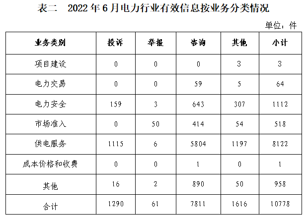 電力行業(yè)排在首位,有效信息數(shù)量為10778件,占全部有效信息的72.93%。群眾關(guān)注的內(nèi)容主要集中在供電服務、停電搶修、用戶受電工程市場秩序等方面。(2022年6月電力行業(yè)有效信息按業(yè)務分類情況見表二)