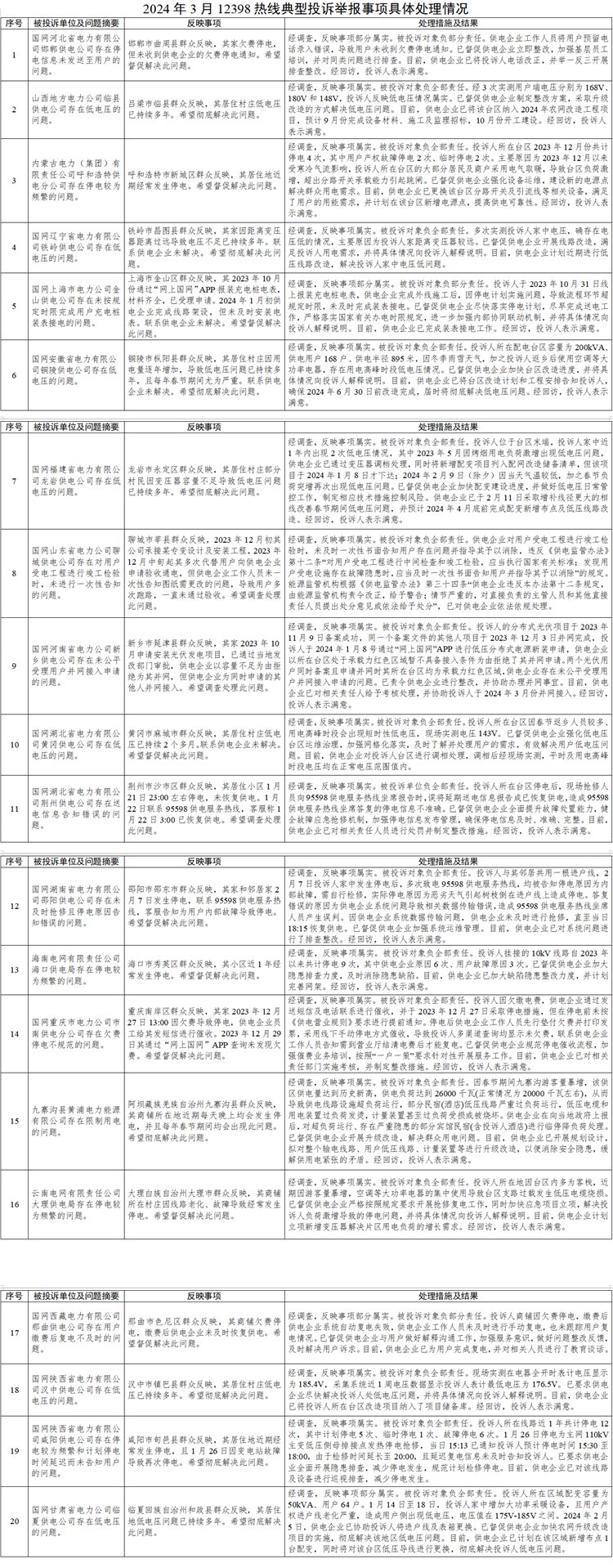 針對(duì)群眾反映的投訴舉報(bào),國(guó)家能源局派出機(jī)構(gòu)嚴(yán)格根據(jù)國(guó)家有關(guān)法規(guī)政策進(jìn)行處理。一是督促供電企業(yè)加強(qiáng)臺(tái)區(qū)等設(shè)備改造力度,縮短供電半徑,提高電網(wǎng)轉(zhuǎn)供、互供能力,有效解決故障停電、低電壓等電能質(zhì)量問(wèn)題,進(jìn)一步提升供電可靠性;二是要求供電企業(yè)加強(qiáng)設(shè)備隱患排查整治和停電搶修管理,加強(qiáng)線路巡視頻次,及時(shí)消除隱患缺陷,增加搶修資源投入,提升設(shè)備管控和停電搶修能力,切實(shí)提高供電質(zhì)量;三是通過(guò)行政處罰、監(jiān)管約談、責(zé)令整改等方式,糾正有關(guān)企業(yè)違法違規(guī)行為,維護(hù)公平公正的市場(chǎng)秩序和群眾合法權(quán)益;四是通過(guò)解釋說(shuō)明、澄清事實(shí),使群眾消除誤解。(2024年3月12398熱線典型投訴舉報(bào)事項(xiàng)具體處理情況,見附件2)