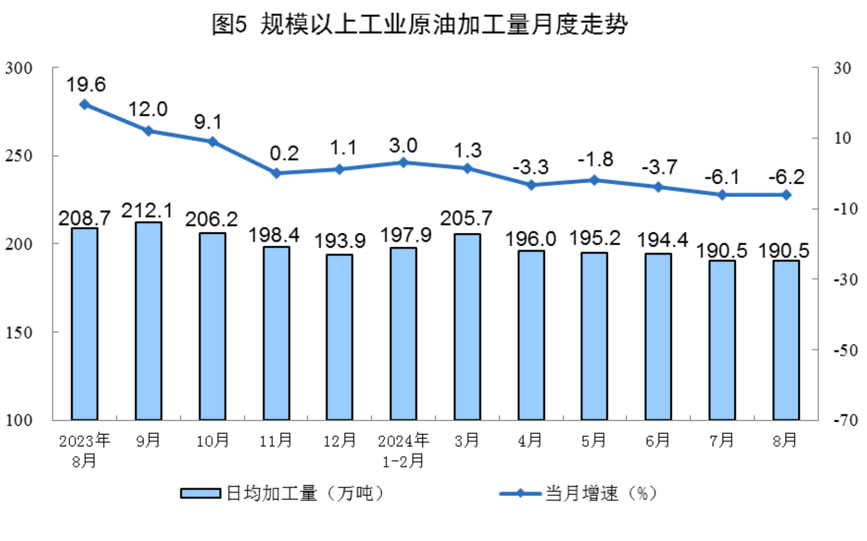 原油生產(chǎn)穩(wěn)定增長(zhǎng)。8月份,規(guī)上工業(yè)原油產(chǎn)量1783萬(wàn)噸,同比增長(zhǎng)2.1%;日均產(chǎn)量57.5萬(wàn)噸。進(jìn)口原油4910萬(wàn)噸,同比下降7.0%。