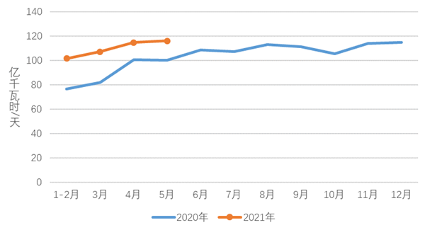 1-5月,化工行業(yè)用電量2048億千瓦時(shí),同比增長(zhǎng)12.8%,增速比上年同期提高17.0個(gè)百分點(diǎn);建材行業(yè)用電量1580億千瓦時(shí),同比增長(zhǎng)24.4%,增速比上年同期提高31.8個(gè)百分點(diǎn);黑色金屬冶煉行業(yè)用電量2639億千瓦時(shí),同比增長(zhǎng)18.3%,增速比上年同期提高19.8個(gè)百分點(diǎn);有色金屬冶煉行業(yè)用電量2763億千瓦時(shí),同比增長(zhǎng)10.2%,增速比上年同期提高8.2個(gè)百分點(diǎn)。