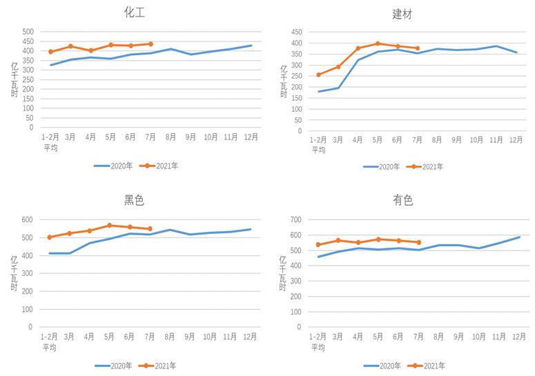 1-7月,化工行業(yè)用電量2911億千瓦時(shí),同比增長(zhǎng)11.4%,增速比上年同期提高14.2個(gè)百分點(diǎn);建材行業(yè)用電量2343億千瓦時(shí),同比增長(zhǎng)17.1%,增速比上年同期提高19.5個(gè)百分點(diǎn);黑色金屬冶煉行業(yè)用電量3749億千瓦時(shí),同比增長(zhǎng)14.5%,增速比上年同期提高14.2個(gè)百分點(diǎn);有色金屬冶煉行業(yè)用電量3880億千瓦時(shí),同比增長(zhǎng)9.0%,增速比上年同期提高6.9個(gè)百分點(diǎn)。