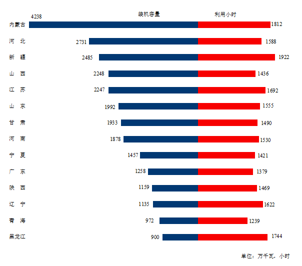 圖3 1-9月份風(fēng)電裝機(jī)較多省份風(fēng)電裝機(jī)容量和設(shè)備利用小時(shí)