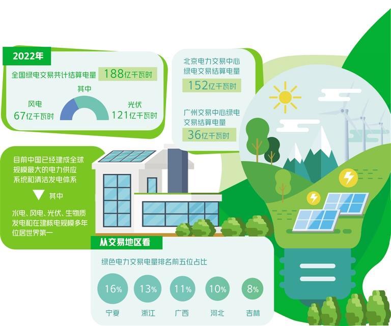 在政策推動下,綠電交易規(guī)模進一步擴大。國網(wǎng)能源研究院數(shù)據(jù)顯示,2022年,全國綠電交易共計結(jié)算電量188億千瓦時。其中,風電67億千瓦時,光伏121億千瓦時。北京電力交易中心綠電交易結(jié)算電量152億千瓦時,廣州交易中心綠電交易結(jié)算電量36億千瓦時。從交易地區(qū)看,綠色電力交易電量排名前五位的是寧夏、浙江、廣西、河北、吉林,占綠色電力交易總電量的16%、13%、11%、10%、8%。