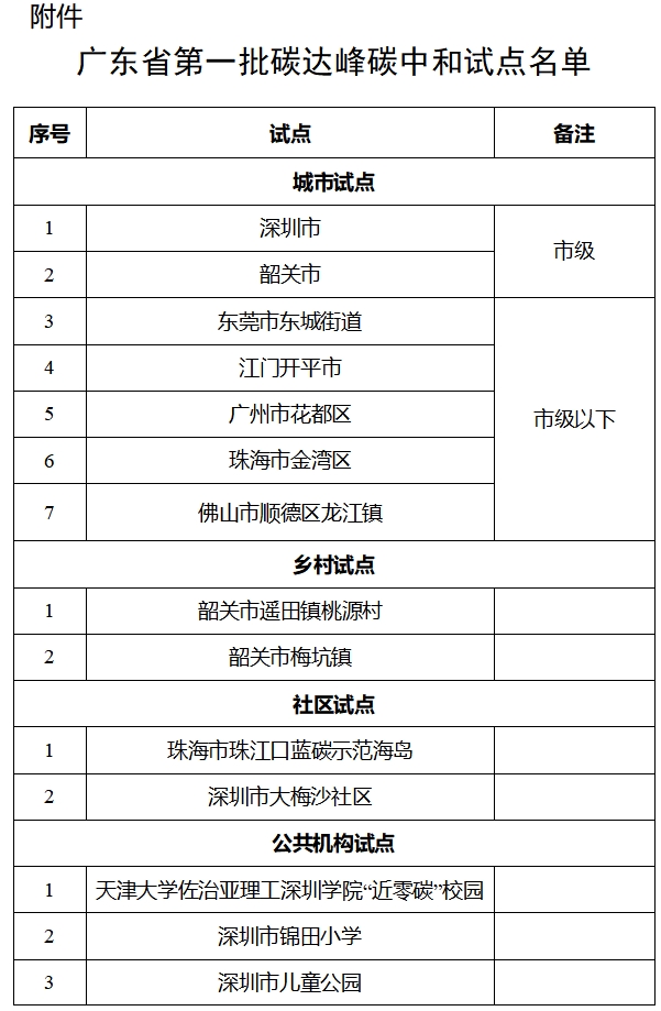 廣東省公布第一批碳達(dá)峰碳中和試點公示名單