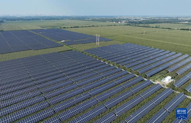 8月21日拍攝的河北省衡水市冀州區(qū)冀州鎮(zhèn)附近的“農(nóng)光互補(bǔ)”光伏發(fā)電場(chǎng)(無(wú)人機(jī)照片)。新華社記者 楊世堯 攝