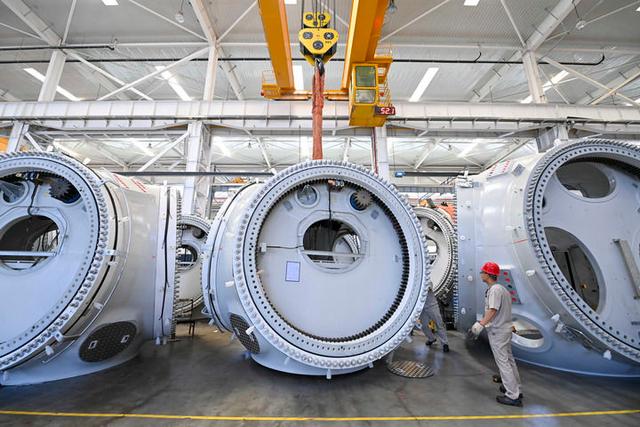 工人在位于山西轉(zhuǎn)型綜合改革示范區(qū)的太重集團(tuán)新能源產(chǎn)業(yè)園區(qū)吊運(yùn)風(fēng)電裝備(2024年5月30日攝)。新華社記者 楊晨光 攝