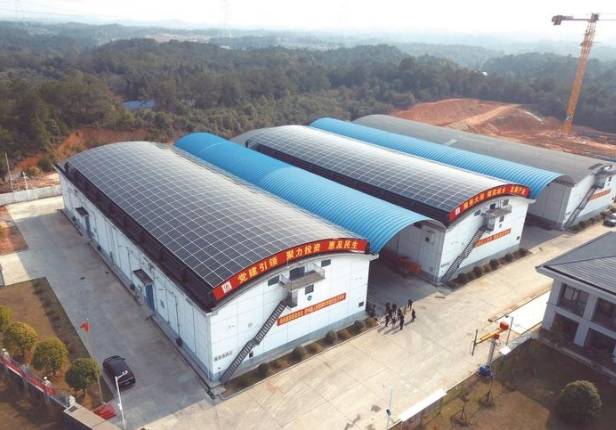 一排排光伏板在糧食倉(cāng)庫(kù)上方匯成一個(gè)弧形屋頂,與不遠(yuǎn)處的青山綠水相映生輝,共同造就了路口鎮(zhèn)亮眼的“綠色風(fēng)景”。