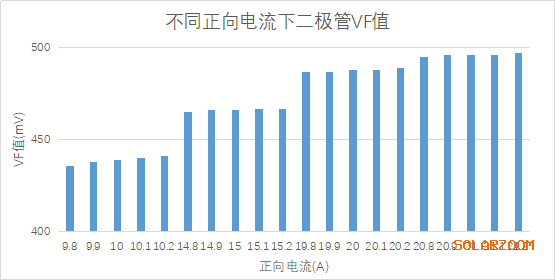 按照實(shí)測的兩個(gè)芯片VF值相差3mV來考量的話,將正向電流區(qū)間縮小再次測試,得到下圖數(shù)據(jù)??梢酝茰y,如果雙芯片二極管兩個(gè)芯片間VF相差3mV,則2個(gè)芯片間分流相差不超過0.2A。實(shí)際上,在二極管結(jié)溫測試以及光伏組件戶外使用時(shí),0.2A的電流也是完全在誤差波動(dòng)范圍內(nèi)。