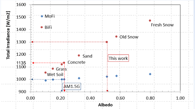 圖1中縱軸包括兩個關(guān)鍵點:1300w/m²和1135w/m²。135w/m²對應(yīng)于IEC 60904-3中定義的環(huán)境條件下雙面組件離地高度1米時背面所接受到的平均輻照度?;诖说玫降碾p面組件在BNPI條件下的測試結(jié)果不僅與傳統(tǒng)STC條件下的結(jié)果具有良好的兼容性,并且使在相同的條件下對雙面和單面組件的光伏性能進(jìn)行直接對比成為可能。除此外,BNPI條件下的性能測試結(jié)果也可以為組件選型和系統(tǒng)設(shè)計提供具有價值的參考信息。由于背面發(fā)電,雙面組件在戶外通常比單面組件產(chǎn)生更高的電流。較高的電流可能導(dǎo)致光伏組件局部溫度過高,特別是在發(fā)生電流聚集的區(qū)域。因此新版2021版 61215標(biāo)準(zhǔn)中的相關(guān)測試條件相應(yīng)進(jìn)行了修訂來反映出雙面組件在戶外高電流的情況。1300w/m²是綜合各種不同應(yīng)用場景下可能達(dá)到的背面輻照度的極端情況、實際應(yīng)用中這些場景的出現(xiàn)概率而確定的一個較為合理的強度,從圖1中也可以看出1300w/m²這個點已經(jīng)能覆蓋絕大部分的地表反射率,可以被認(rèn)為是一個合理的針對雙面組件可靠性驗證測試的背面輻照度。