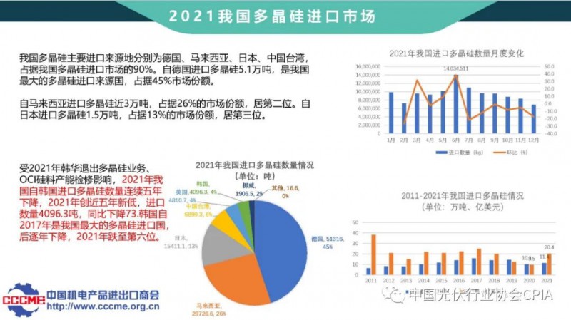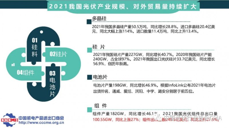 中國機(jī)電產(chǎn)品進(jìn)出口商會光伏分會秘書長張森介紹光伏產(chǎn)品國際貿(mào)易情況。2021年我國光伏產(chǎn)業(yè)規(guī)模、對外貿(mào)易量持續(xù)擴(kuò)大,行業(yè)發(fā)展主要痛點是光伏貿(mào)易摩擦再次升級、海運(yùn)費(fèi)和匯率大幅上漲等。