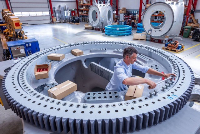 ▲德國(guó)羅斯托克,Eno能源公司的一名員工在風(fēng)力渦輪機(jī)軸承上工作。圖片來(lái)源:Jens Büttner/ Alamy