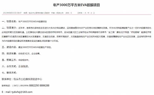 8月15日,內蒙古包頭市土默特右旗人民政府發(fā)布年產(chǎn)3000萬平方米EVA膠膜項目的招商信息。根據(jù)文件顯示,該項目總投資3億元,企業(yè)自籌。文件表示,近年來,國家西北部地區(qū)正在進行大批光伏電站建設,這將直接推動光伏產(chǎn)業(yè)在西北地區(qū)集群化發(fā)展。作為光伏新能源配套產(chǎn)業(yè)之一的EVA膠膜項目也必將迎來更大的發(fā)展機遇。土右旗地處內蒙古自治區(qū)首府呼和浩特市、自治區(qū)最大的工業(yè)城市包頭市和煤都鄂爾多斯市“金三角”腹地;位于我國“呼包銀榆”能源經(jīng)濟帶的重要節(jié)點;是西北地區(qū)重要的光伏發(fā)展基地,交通區(qū)位優(yōu)越,政策環(huán)境良好,太陽能晶硅電池產(chǎn)業(yè)已經(jīng)形成較大規(guī)模,非晶硅薄膜電池產(chǎn)業(yè)也正在發(fā)展,這些有利條件將為EVA膠膜項目的建設和發(fā)展奠定堅實的基礎,項目前景十分可觀。