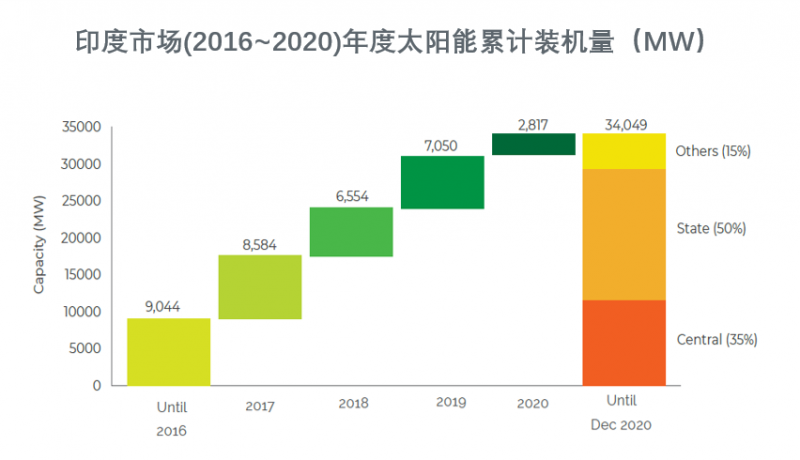 2020年,印度新增了約2.8 GW的公用事業(yè)規(guī)模太陽能裝機容量和1.8 GW的屋頂太陽能容量,較2019年下降了65%