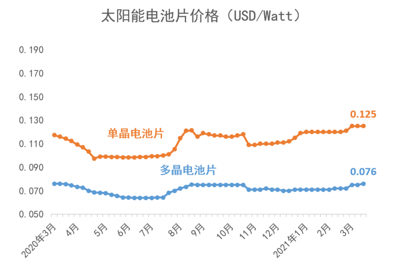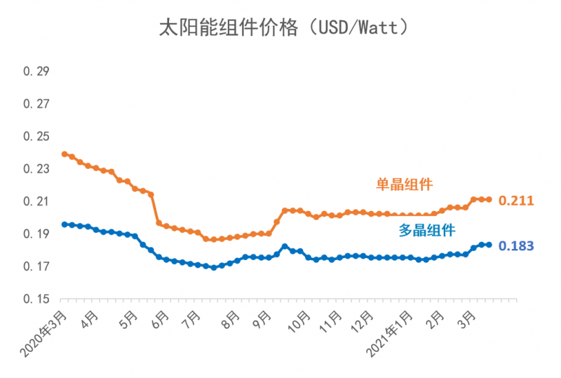 從2021年年初開始,多晶硅短缺的狀況持續(xù)加劇。2021年3月,歷經(jīng)了傳統(tǒng)的春節(jié)假期之后,上游多晶硅環(huán)節(jié)更加供不應(yīng)求,目前的價格相比于2021年1月6日的價格已上漲了41%;同時,由于上游多晶用料呈現(xiàn)價格上漲,硅片端的價格同時跳漲。