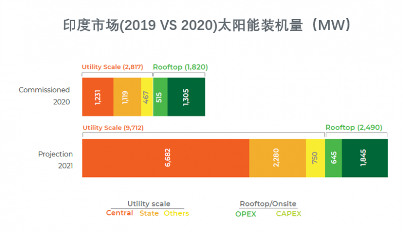 2021,印度市場預(yù)計將投產(chǎn)約9.7GW的新公用事業(yè)規(guī)模太陽能項目和2.5GW的屋頂/現(xiàn)場太陽能項目