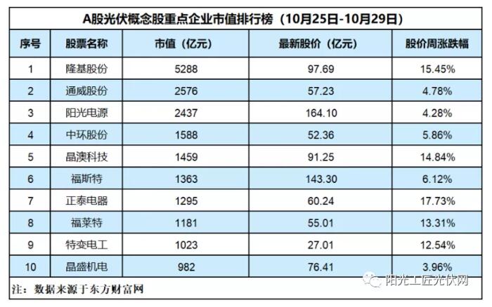 上周(10月25日-29日)光伏板塊再度爆發(fā),記者重點(diǎn)監(jiān)測(cè)的10家企業(yè)全線上漲,其中,正泰電器周度上漲17.73%,隆基股份上漲15.45%,晶澳科技漲了14.84%,福萊特上漲13.31%。晶澳科技、特變電工的最新市值分別為1459億元和1023億元,排名上升,成為排行榜第五、第九位。