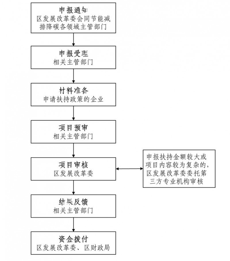 (四)審核審定。各領(lǐng)域主管部門負(fù)責(zé)扶持項目申請材料的形式審查,提出預(yù)審意見。區(qū)發(fā)展改革委對項目和扶持金額進行審核,其中申報扶持金額較大或項目內(nèi)容較為復(fù)雜的,由區(qū)發(fā)展改革委安排第三方專業(yè)機構(gòu)委托評審。