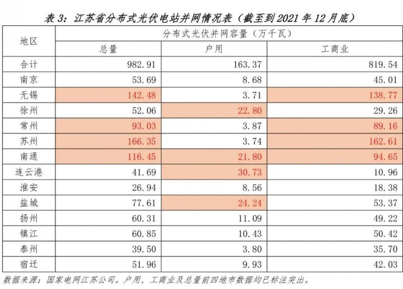 根據電網公司分布式光伏并網數據,截止到 2021 年 12 月,江蘇分布式光伏累計并網規(guī)模為 982.91 萬千瓦,其中,累計戶用光伏并網 163.37 萬千瓦,約占比17%;累計工商業(yè)分布式光伏并網 819.54 萬千瓦,約占比 83%??梢?,江蘇分布式光伏市場以工商業(yè)分布式為絕對主導。