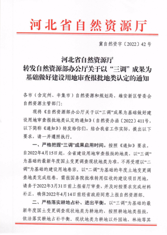 近期,河北省自然資源廳轉發(fā)自然資源部辦公廳關于以“三調”成果為基礎做好建設用地審查報批地類認定的通知,按照《通知》要求,自2022年4月15日起,全省建設用地審查報批的地類,以“三調”為基礎的最新年度國土變更調查現(xiàn)狀地類為準,不再受理以“二調”為基礎的建設用地卷宗。