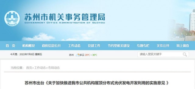 意見明確,到2025年底,蘇州市公共機(jī)構(gòu)新建建筑可安裝光伏屋頂面積實(shí)現(xiàn)光伏覆蓋率達(dá)到50%以上,全市公共機(jī)構(gòu)既有建筑屋頂建設(shè)光伏設(shè)施,安裝比例不低于可安裝光伏屋頂面積的50%。常熟市、吳江區(qū)、吳中區(qū)、相城區(qū)等四個(gè)全國(guó)整縣(市、區(qū))屋頂分布式光伏開發(fā)試點(diǎn)地區(qū)公共機(jī)構(gòu)于2023年底前達(dá)成上述目標(biāo)