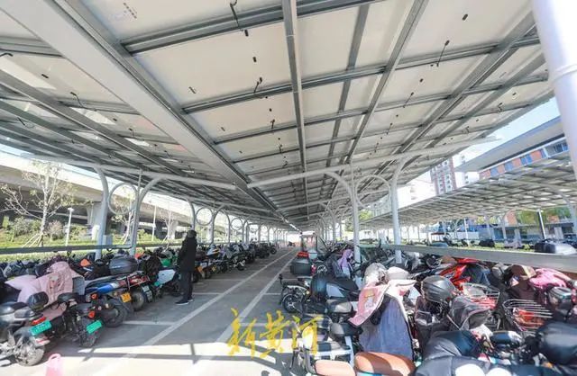 山東大學(xué)國(guó)家大學(xué)科技園停車(chē)場(chǎng)的車(chē)棚采用光伏一體化結(jié)構(gòu),光伏面板架設(shè)于停車(chē)位上方的鋼桁架上,以光伏電池板代替車(chē)棚頂面,既能避免車(chē)輛日曬雨淋,所發(fā)出的電力又能為園區(qū)、車(chē)棚提供照明,起到一舉多得的效果。車(chē)棚內(nèi)安裝了充電樁、儲(chǔ)能等配套設(shè)施,可以為電動(dòng)汽車(chē)、電動(dòng)自行車(chē)充電,實(shí)現(xiàn)了光儲(chǔ)充一體化,綠色低碳場(chǎng)景再添新貌,進(jìn)一步邁向智慧零碳園區(qū)。