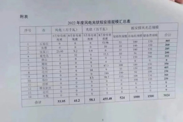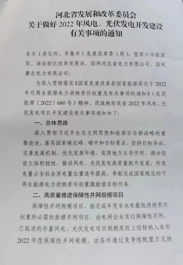 近日,河北省發(fā)改委發(fā)布《關(guān)于做好2022年風(fēng)電、光伏發(fā)電開發(fā)建設(shè)有關(guān)事項(xiàng)的通知》,根據(jù)文件:河北2022年擬安排保障性風(fēng)電、光伏規(guī)模5.24GW,市場化規(guī)模10GW、儲備規(guī)模15GW。