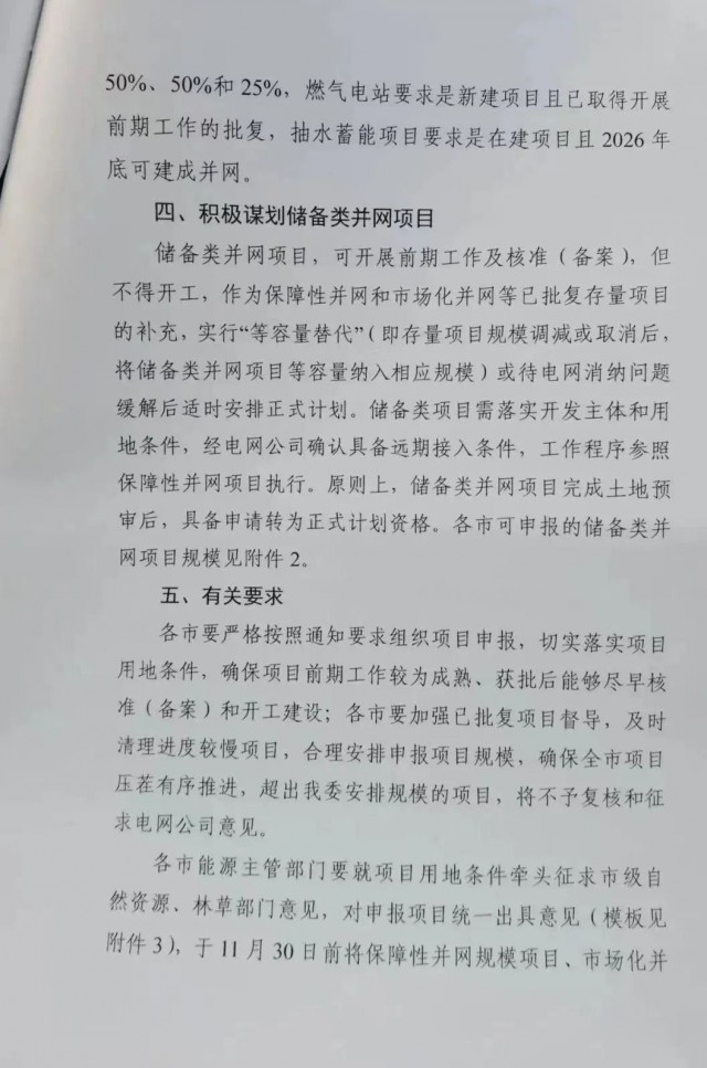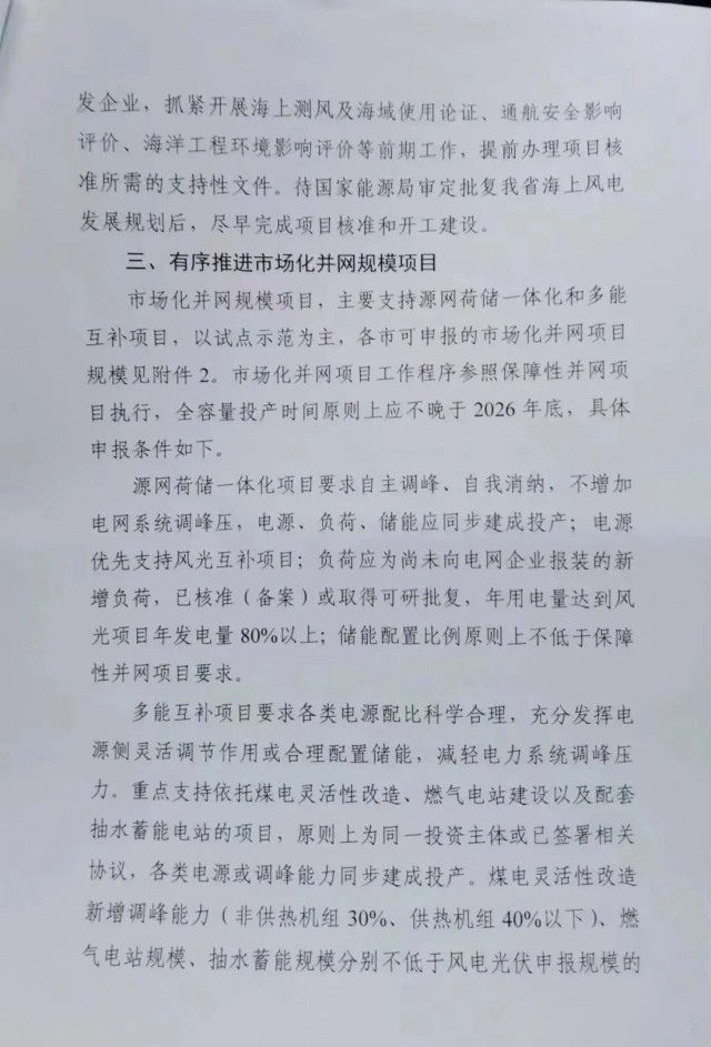 市場化項(xiàng)目參照保障性并網(wǎng)項(xiàng)目執(zhí)行,源網(wǎng)荷儲一體化項(xiàng)目年用電量要達(dá)到風(fēng)、光項(xiàng)目年發(fā)電量的80%以上,儲能配置要求不得低于保障性項(xiàng)目。多能互補(bǔ)項(xiàng)目煤電新增調(diào)峰能力、燃?xì)怆娬?、抽水蓄能?guī)模不得低于風(fēng)、光申報(bào)規(guī)模的50%、50%、25%。市場化項(xiàng)目全容量投產(chǎn)時(shí)間不晚于2026年底。